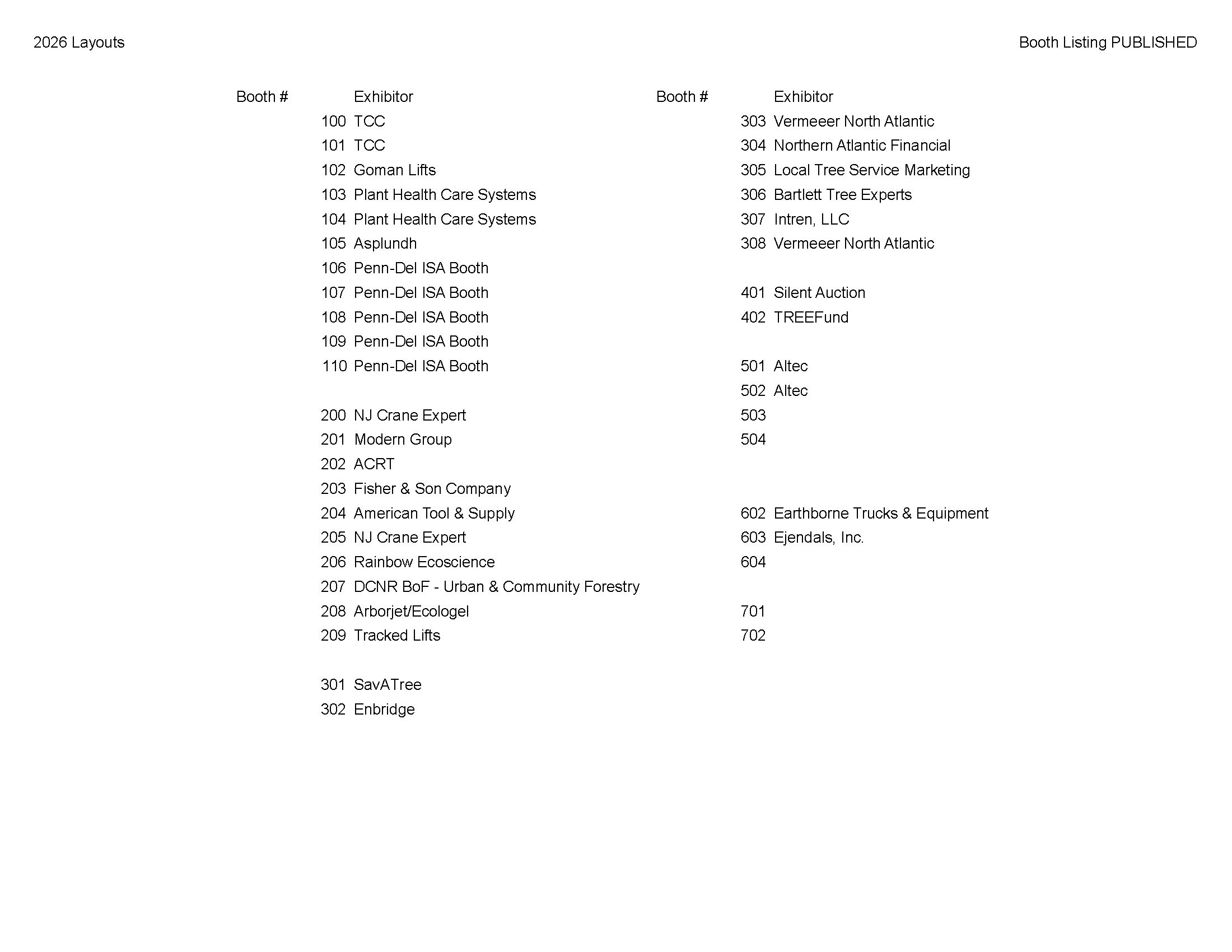 Exhibit Hall Pricing for Penn Del ISA 61st Annual Shade Tree SymposiumMarch 16-17, 2026Lebanon Valley Expo Center, Lebanon, PATo complete the exhibitor or Sponsor registration, CLICK HERE Penn-Del ISA offers several sponsorship options and exhibitor booth opportunities for the upcoming 2026 Shade Tree Symposium. Each 10x10 booth registration includes 2 exhibitor passes and meals served throughout the conference. Additional exhibitor registrations can be purchased for $200 each. Booth Space - $950 each (booths of 6 or more are subject to a 10% discount)Show Sponsor - $5000 (exclusive sponsorship)